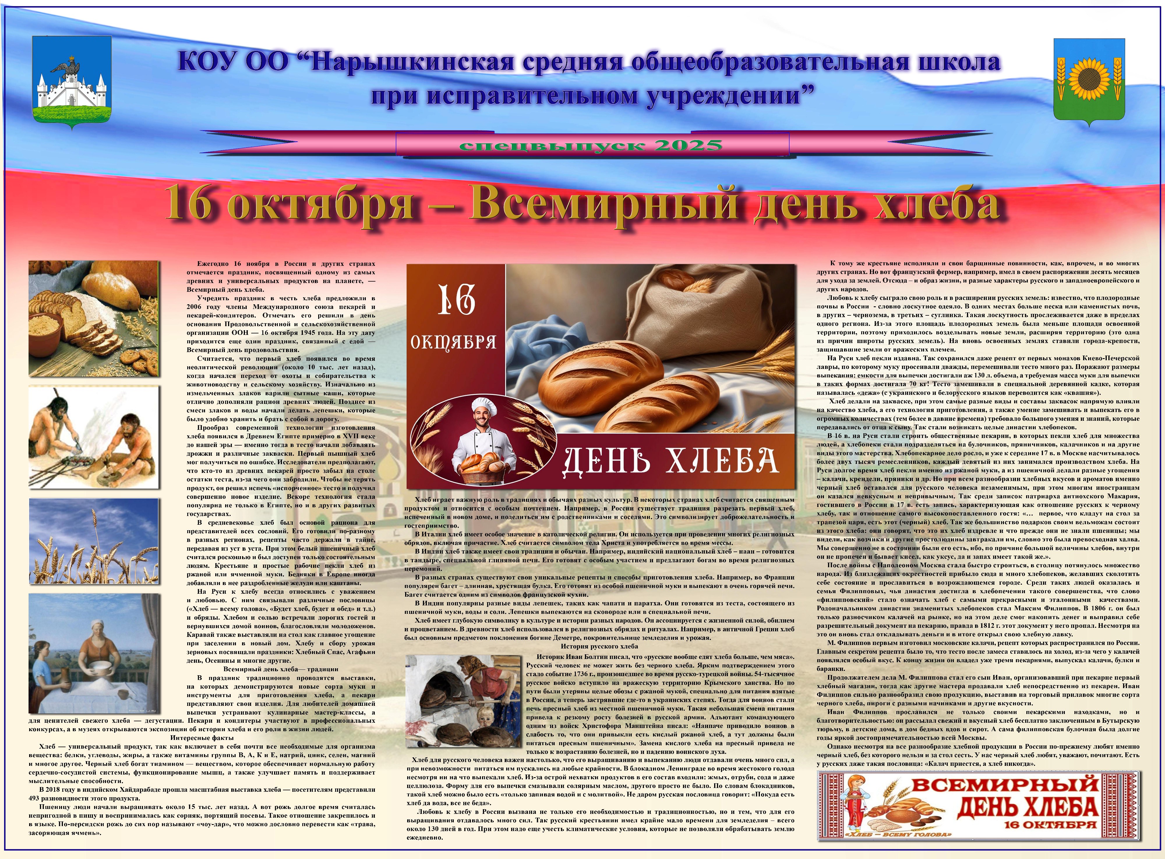 В образовательном учреждении 16 октября 2025 г. издан спецвыпуск стенной печати, посвящённый Всемирному дню хлеба.