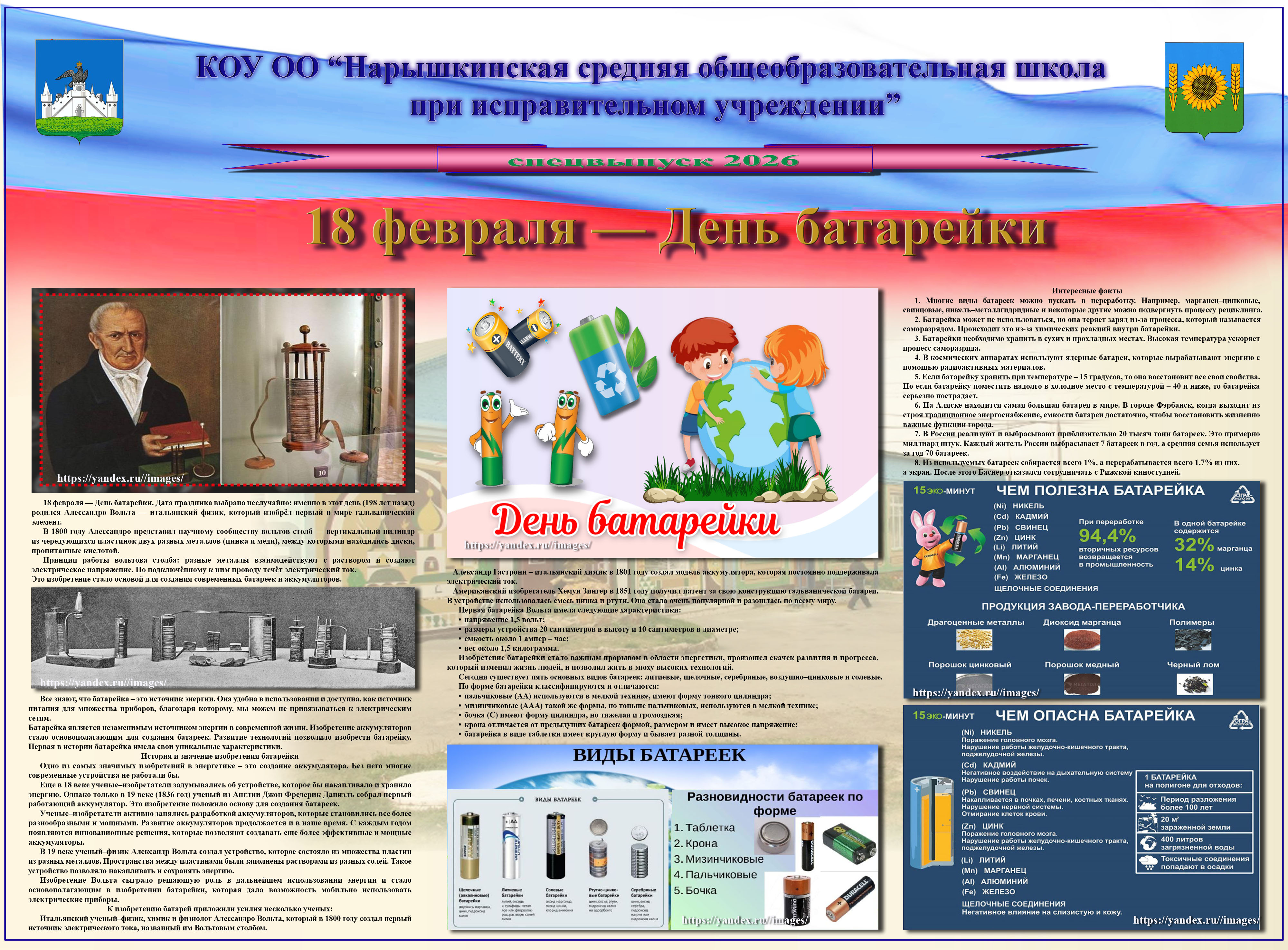 Прообразом современной батарейки стало изобретение итальянского ученого Алессандро Вольта, названное Вольтовым столбом. Сейчас батарейки и аккумуляторы прочно вошли в жизнь человека, а в знак признания заслуг и достижений физика Алессандро Вольта в день рождения ученого отмечается День батарейки.