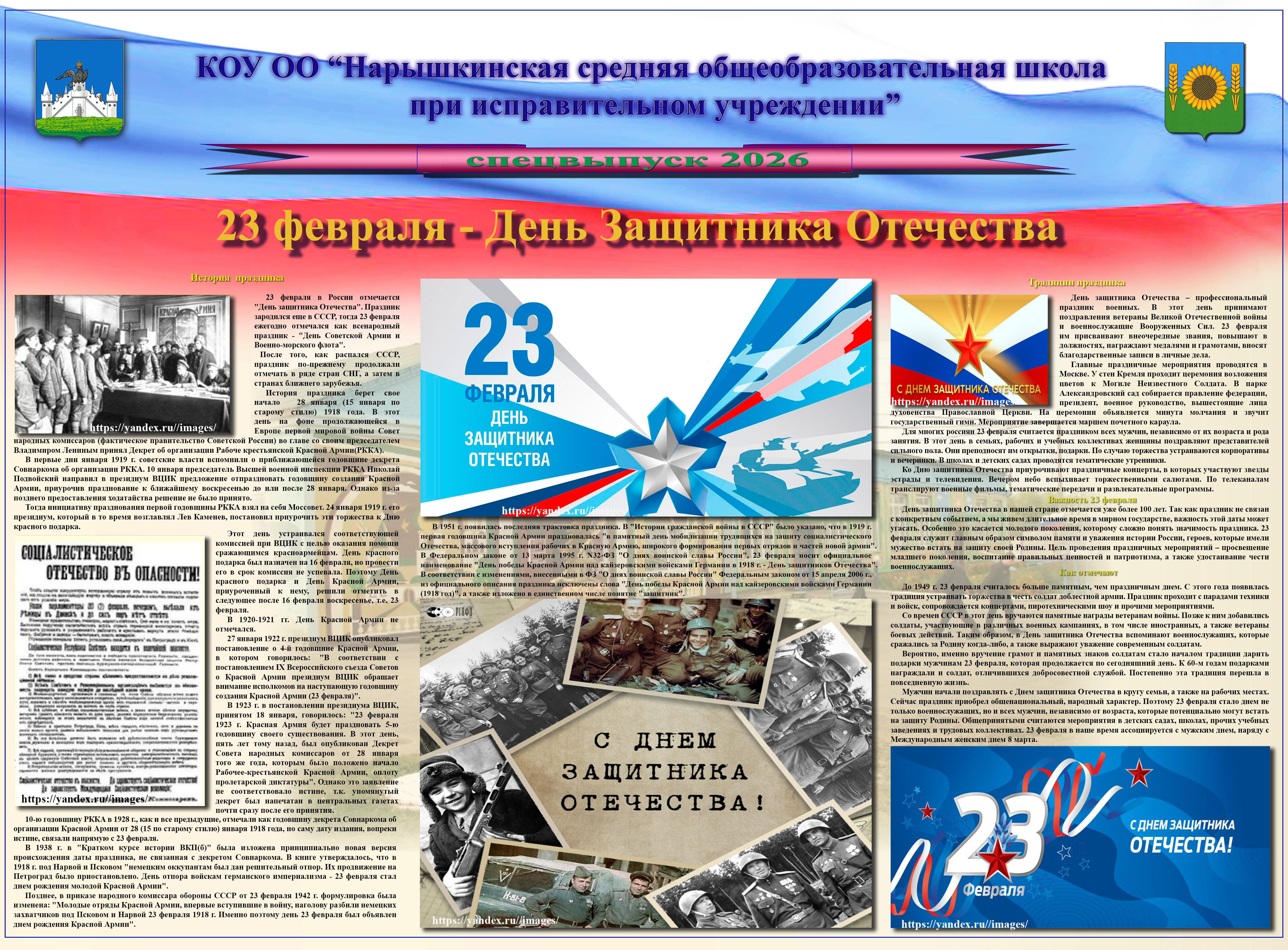 20 февраля 2026 г. в образовательном учреждении было проведено общешкольное мероприятие, посвящённое Дню защитника Отечества. (ответственный учитель истории Сенин Е.Е.). В мероприятии приняли участие обучающиеся 5, 6, 9, 10 и 11-х классов. Так же был издан спецвыпуск стенной печати, посвящённый этому знаменательному событию.