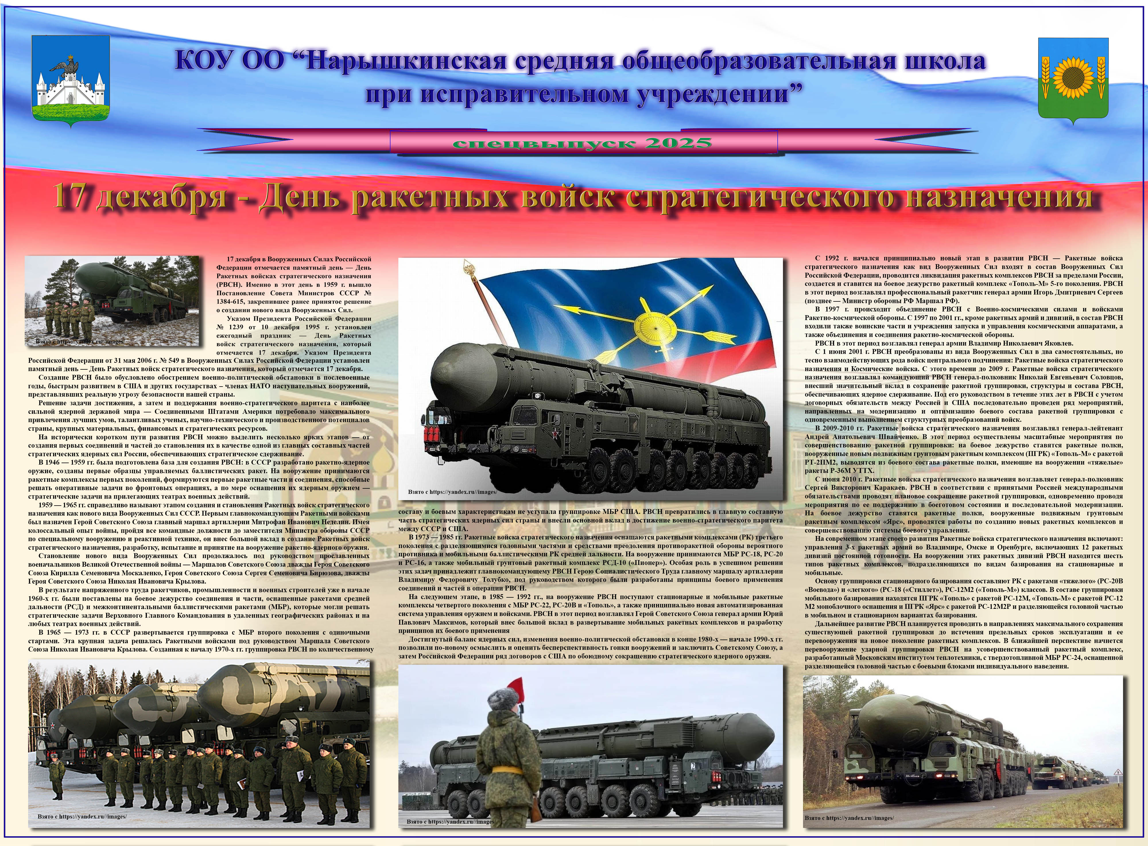 17 декабря в Вооруженных Силах Российской Федерации отмечается памятный день – День Ракетных войск стратегического назначения (РВСН) на основании указа президента РФ от 31 мая 2006 года "Об установлении профессиональных праздников и памятных дней в Вооруженных Силах Российской Федерации".