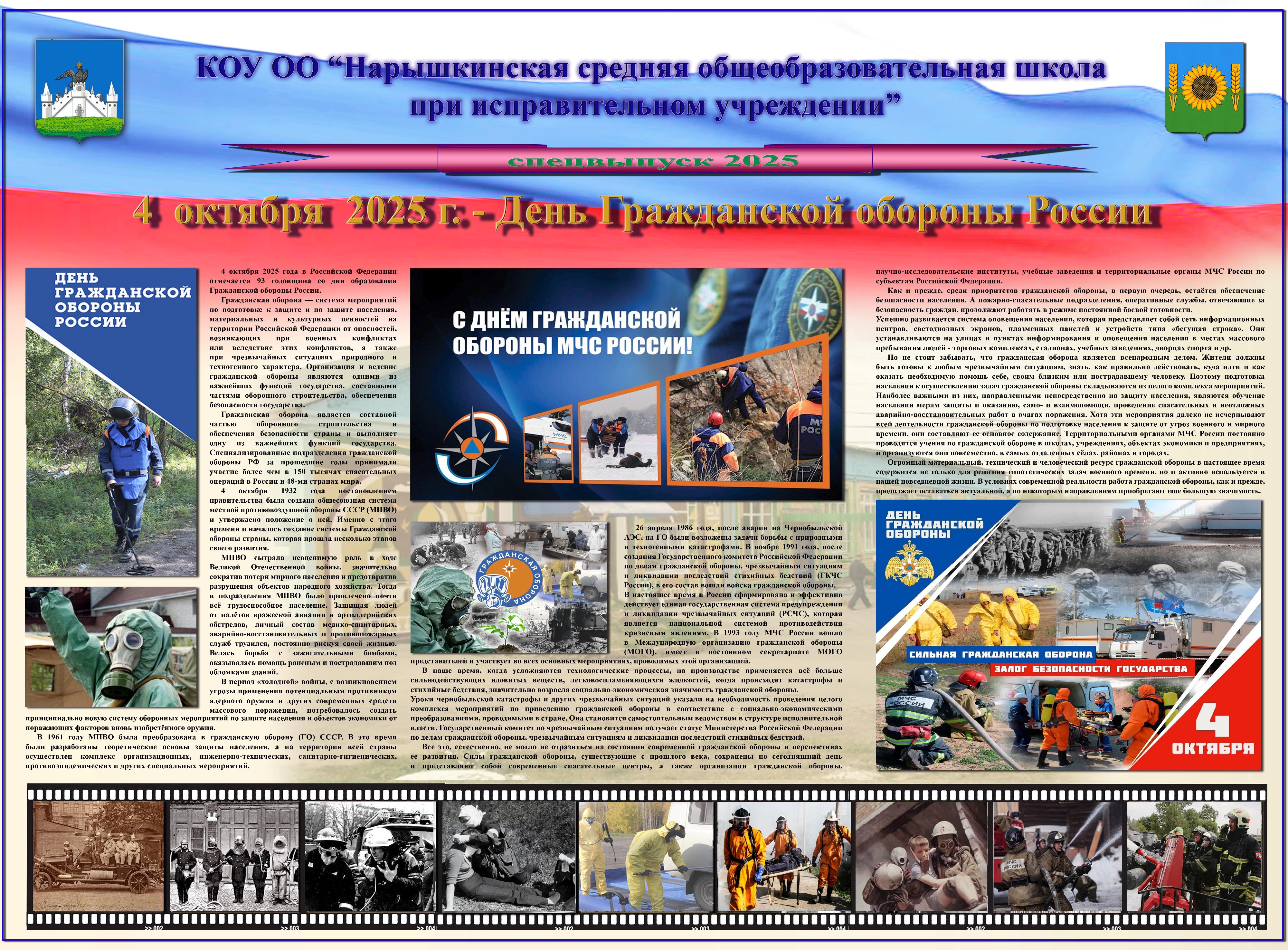 4 октября 2025 г. в образовательном учреждении было проведено общешкольное мероприятие, посвящённое Дню Гражданской обороны (ответственный учитель ОБЗР Рязанцев Н.Н.).Участники данного мероприятия ознакомились с историей данной памятной даты, созданием гражданской обороны в России, действиям при возникновении или угрозе возникновения чрезвычайных ситуаций природного и техногенного характера в местах массового пребывания людей. В ходе мероприятия было проведена викторина среди учащихся по безопасности жизнедеятельности, а так же действиям в чрезвычайных ситуациях.