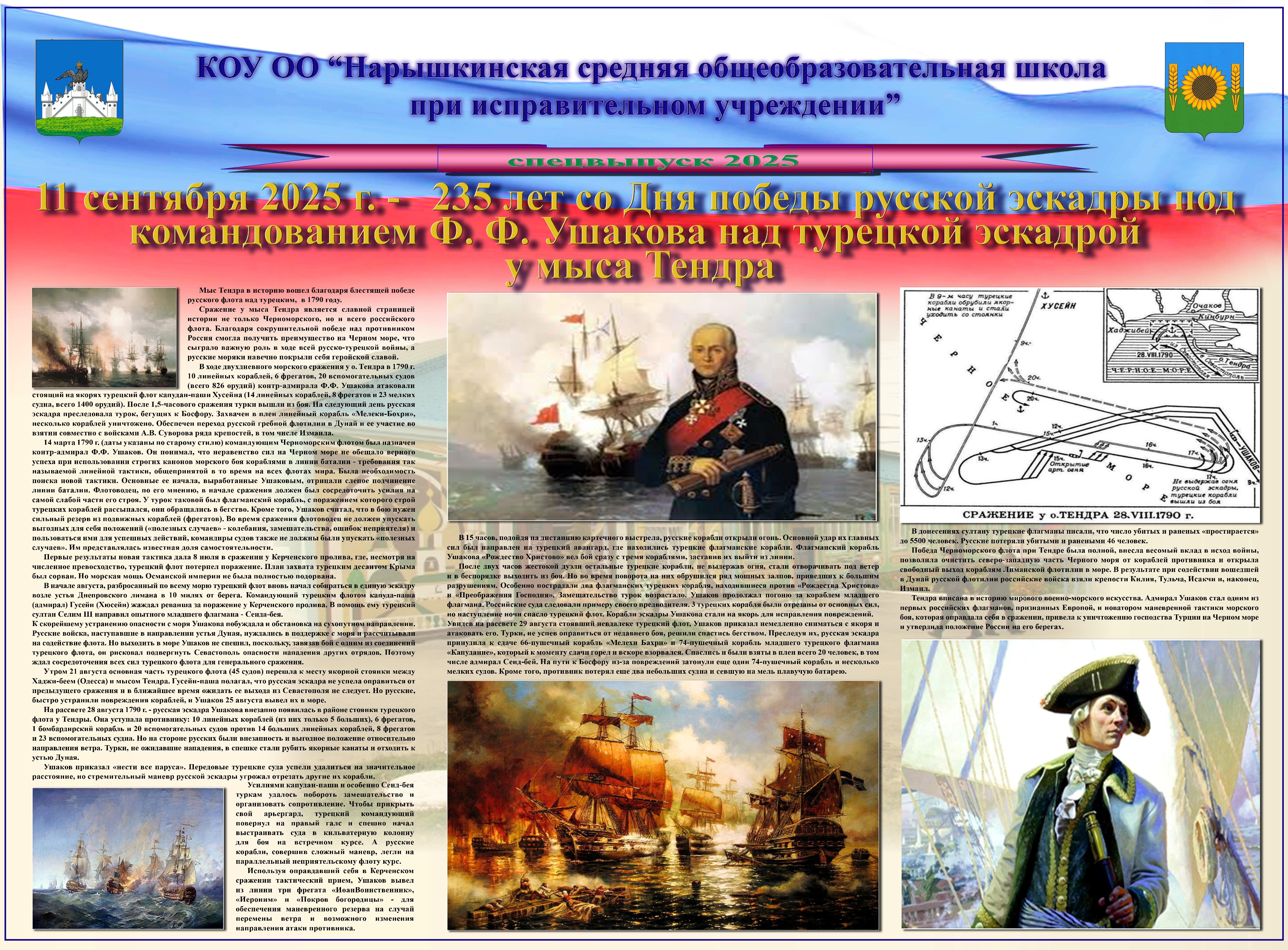 9 сентября 1790 г. завершилось морское сражение у мыса Тендра между русской эскадрой под командованием Ф. Ф. Ушакова и кораблями турецкого флота. В память о победе русского флота 11 сентября отмечается День воинской славы России – День победы русской эскадры под командованием Ф.Ф.Ушакова над турецкой эскадрой у мыса Тендра (1790 год).
