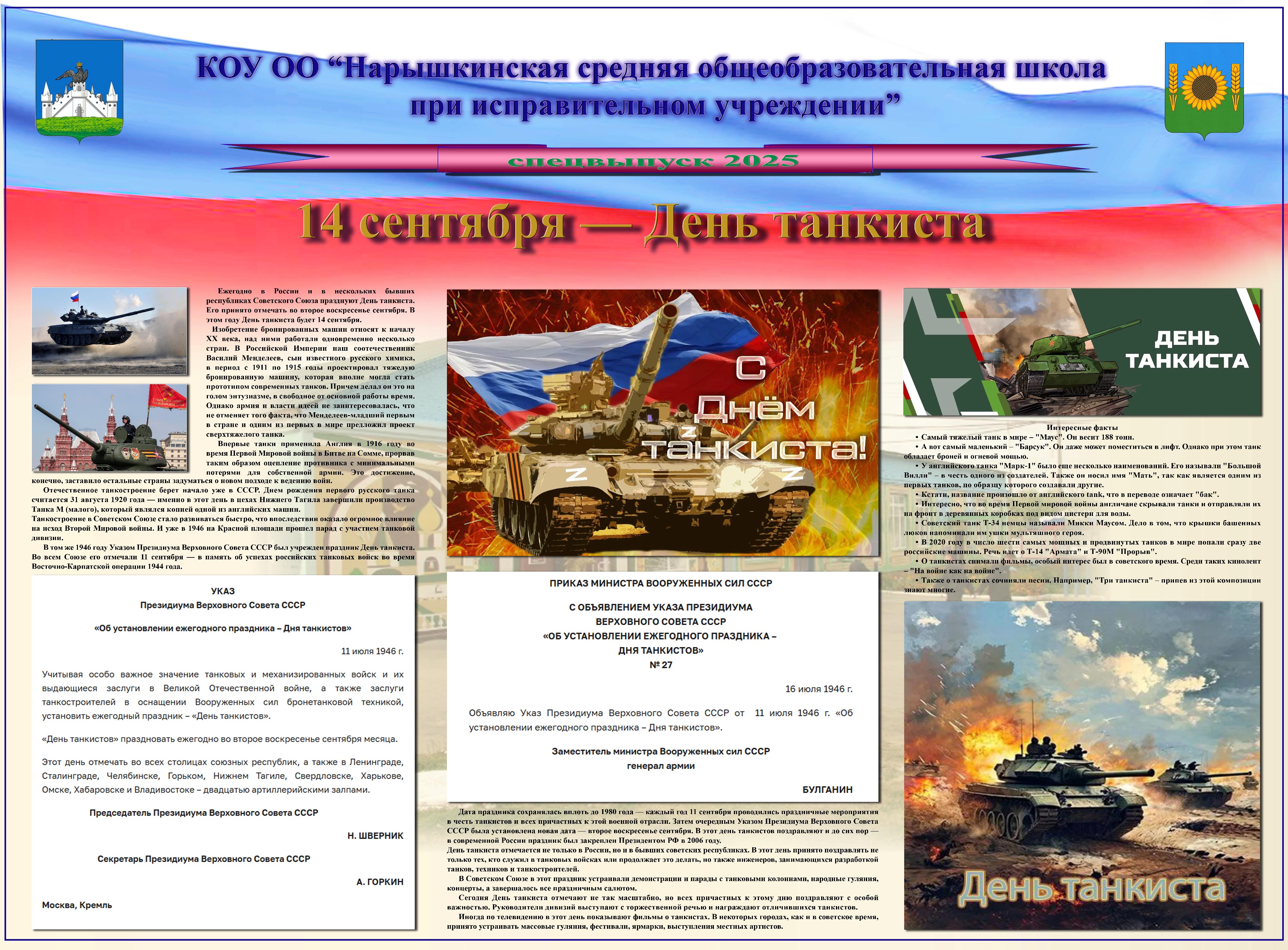 14 сентября 2025 г. в образовательном учреждении издан спецвыпуск стенной печати, посвящённый Дню танкиста.